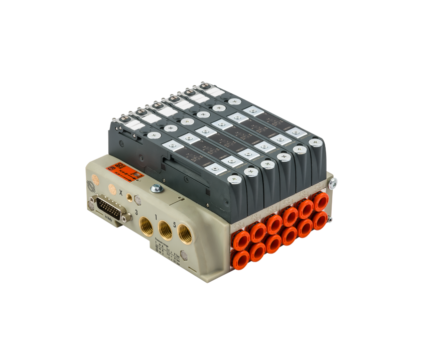 Die EB 80 ist ein elektro-pneumatisches System, das aus Magnetventilen aller Typen, Mehrfachgrundplatten, nach Bedarf platzierbaren pneumatischen und elektrischen Anschlussmodulen, digitalen oder analogen Steuermodulen für Ein- oder Ausgänge und vielem mehr besteht.